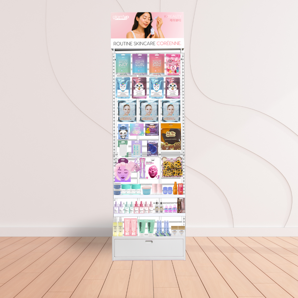 Skincare Découvrez nos mobiliers PRésentoir skincare 60 x 216 x 50 cm PLV prix de vente Tiroir pratique Découvrez nos DERNIères nouveautés Suivez nous sur Instagram